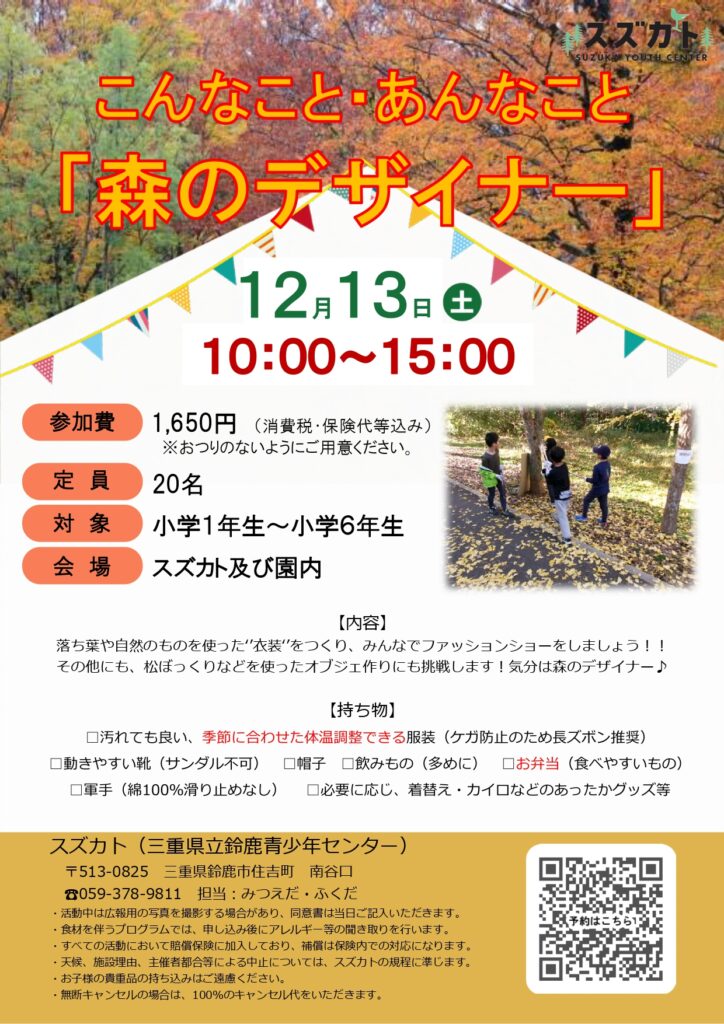 2025.12.05 お知らせ !募集終了!スズカト主催:12/13(土)あんなこと・こんなこと「森のデザイナー」 葉っぱや自然のものをつかったアクセサリーつくりなど、自然の中であんなこと・こんなことなど自分のイメージを形にしてみませんか? ご予約はこちらから NEWS一覧へ →