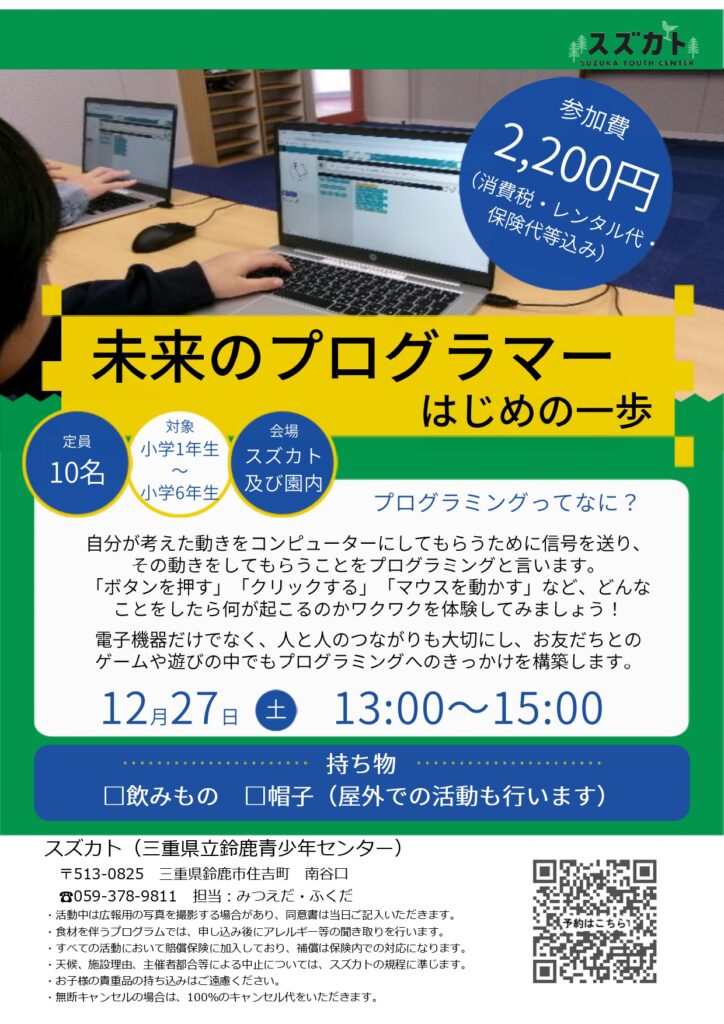 2025.12.05 お知らせ スズカト主催:12/27(土)未来のプログラマー はじめの一歩(募集は終了しました) ”自分でプログラムを入力した動き”がパソコンの画面上に現れる楽しさを感じてみませんか? ご予約はこちらから NEWS一覧へ →
