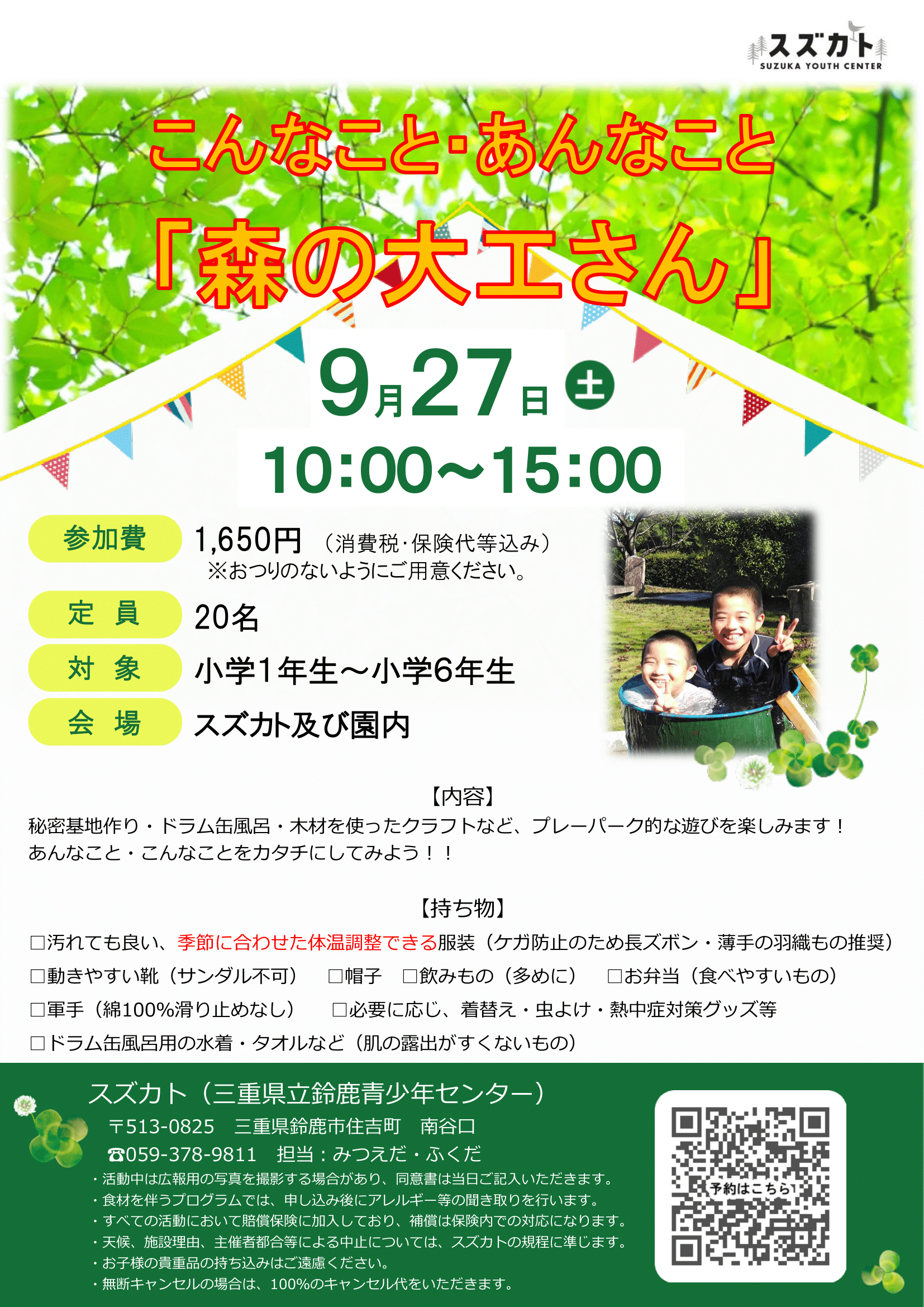 2025.08.31 お知らせ !募集終了!スズカト主催:9/27(土)あんなこと・こんなこと「森の大工さん」 秘密基地作りやドラム缶風呂、木材を使ったクラフトなどプレーパークを楽しみます!あんなことやこんなことを形にしてみませんか? ご予約はこちらから NEWS一覧へ →