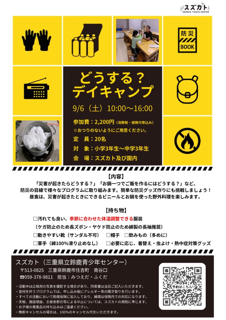 2025.08.07 お知らせ !募集終了!スズカト主催:9/6(土)どうする?デイキャンプ(防災デイキャンプ) 「災害がきたらどうする?」防災目線で様々なプログラムに挑戦しよう! ご予約はこちらから NEWS一覧へ →