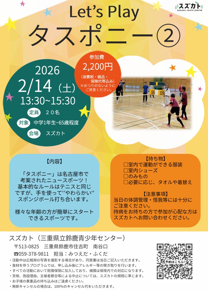 2026.01.25 お知らせ 2/14 (土)「Let’s Play タスポニー②」スズカト 主催事業 五感をフル作動してNEWスポーツを始めよう! 名古屋発祥の痛くない、室内スポーツ! ご予約はこちらから NEWS一覧へ →