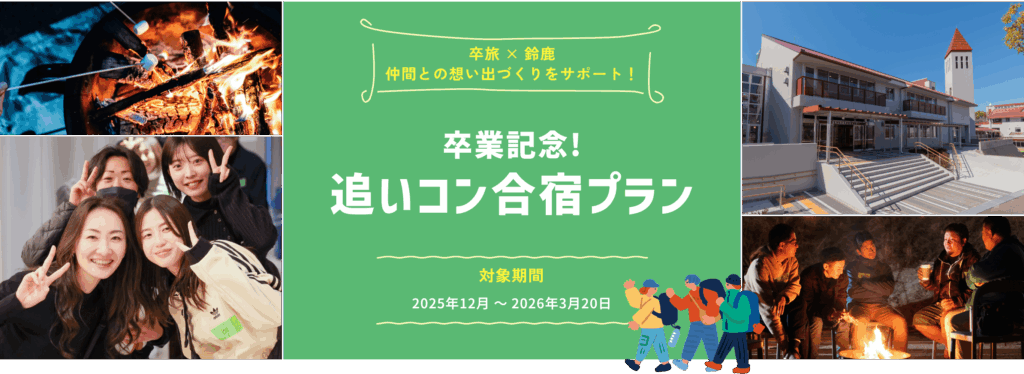 学生生活の締めくくりにぴったりな「卒業記念!追いコン合宿プラン」を期間限定でご用意しました。“仲間と自然の中で過ごす追いコン”という記憶に残る体験をつくりませんか?